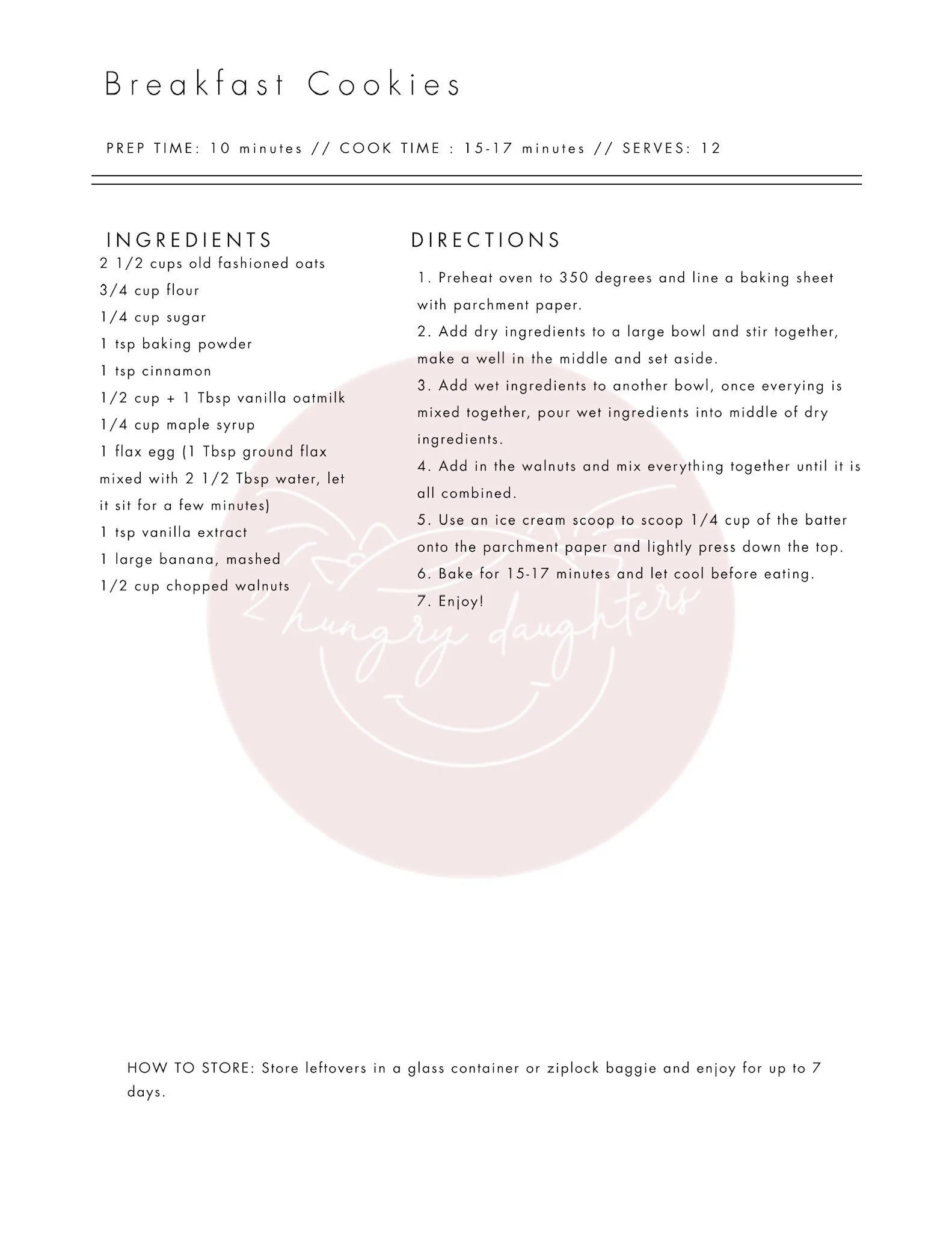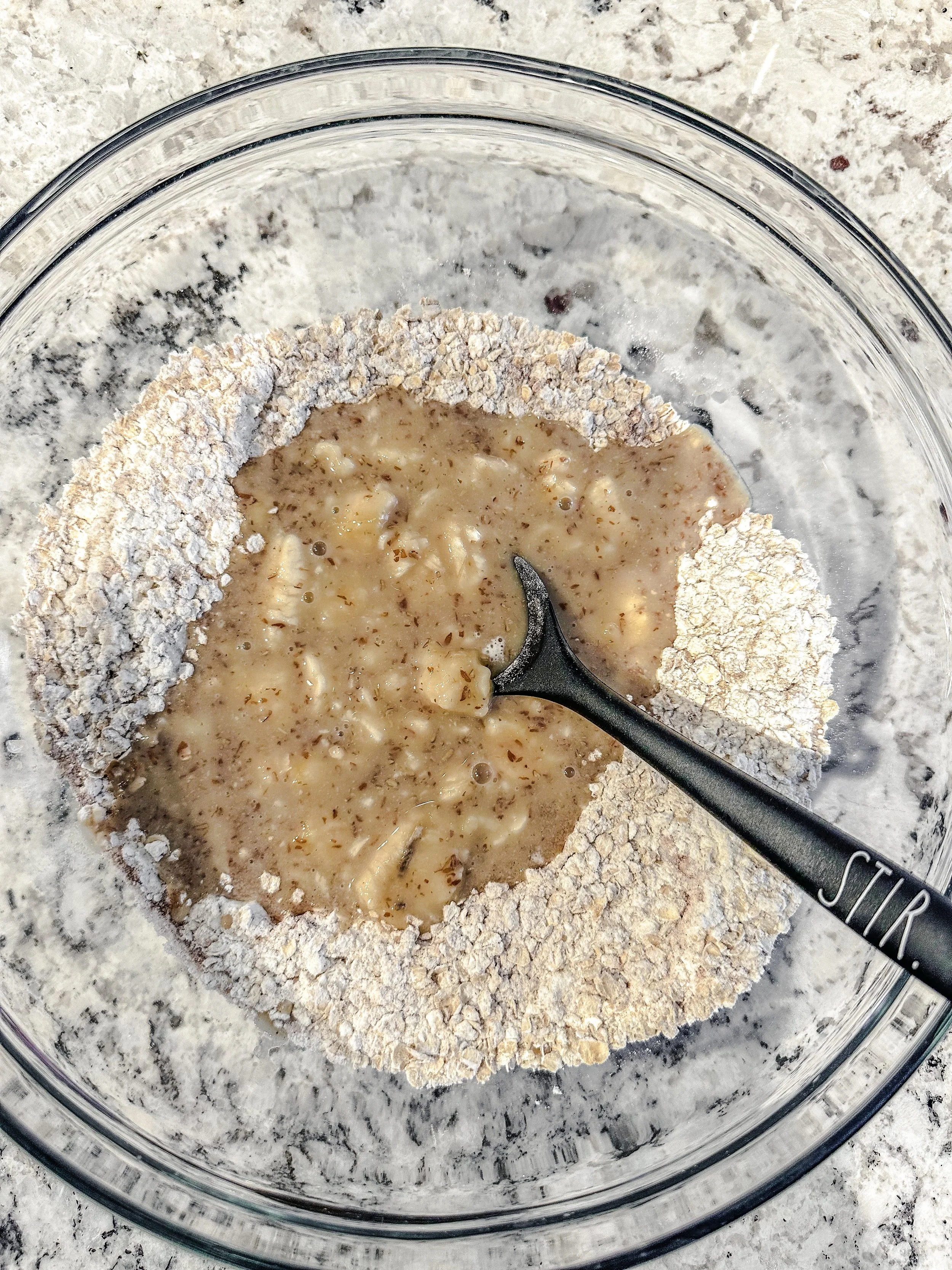 These banana bread breakfast cookies are soft yet hearty and an incredibly forgiving recipe that you can easily customize to your liking. Lets get started. First off, preheat your oven to 350 degrees and line a baking sheet with parchment paper. The easy fix to no extra dishes! In a medium sized mixing bowl, add all of the dry ingredients and stir together, make a well in the middle and set aside. In a smaller mixing bowl, combine all wet ingredients, mix together and pour into the middle of the dry ingredients.