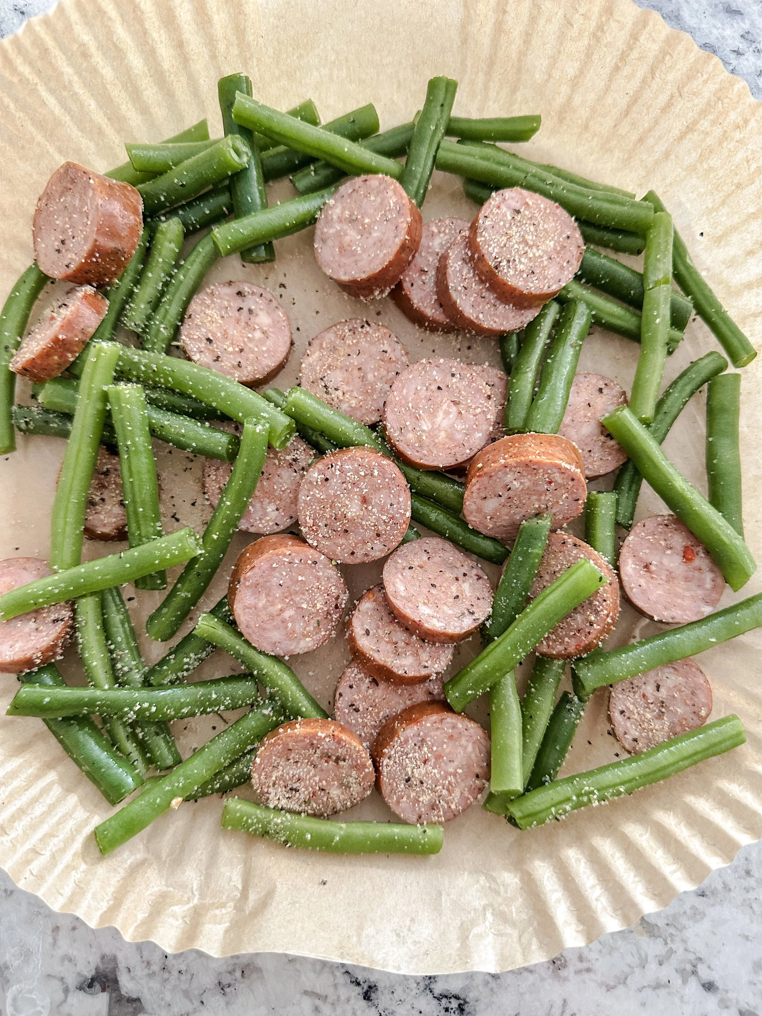 These recipes are meant to be quick, simple and family friendly. This one goes so fast. Cut chicken sausage into coins and place on an air fryer liner or in the air fryer. Wash and trim green beans, add to the sausage. Season with your favorite all purpose rub. Cook in the air fryer at 400 degrees for about 10-15 minutes. When it is almost done, place your 90 second rice in the microwave and cook. Add rice into a large bowl followed by sausage and green beans. Drizzle yum yum sauce over top. Enjoy!