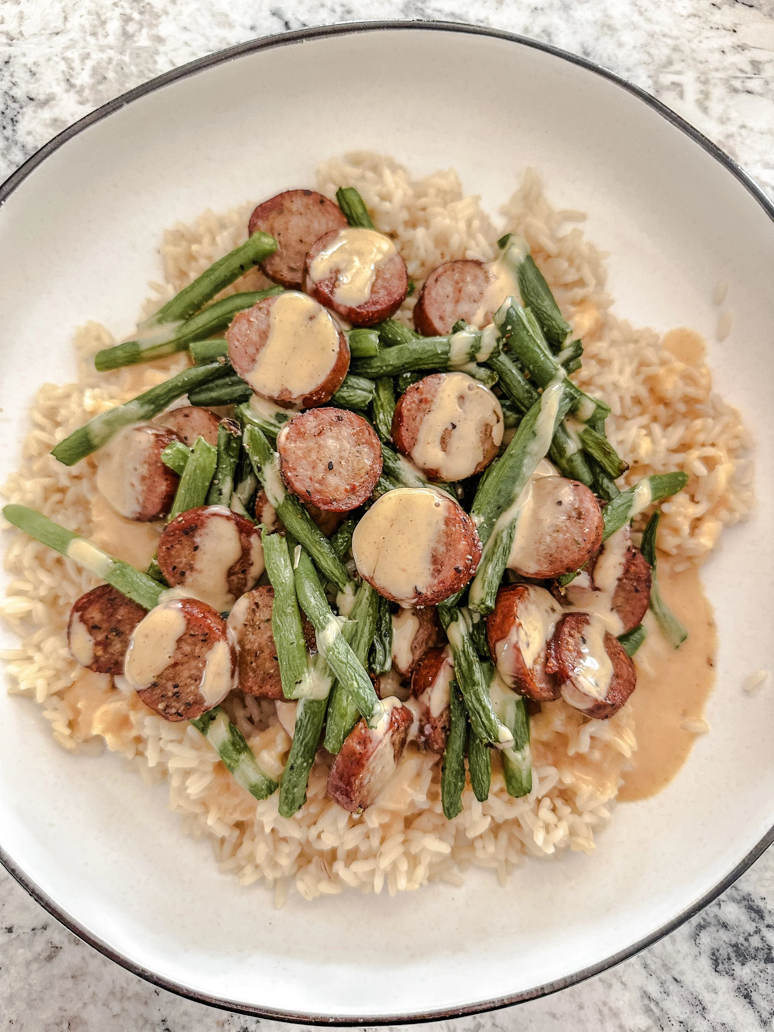 Chicken sausage and green bean rice bowls with yum yum sauce.