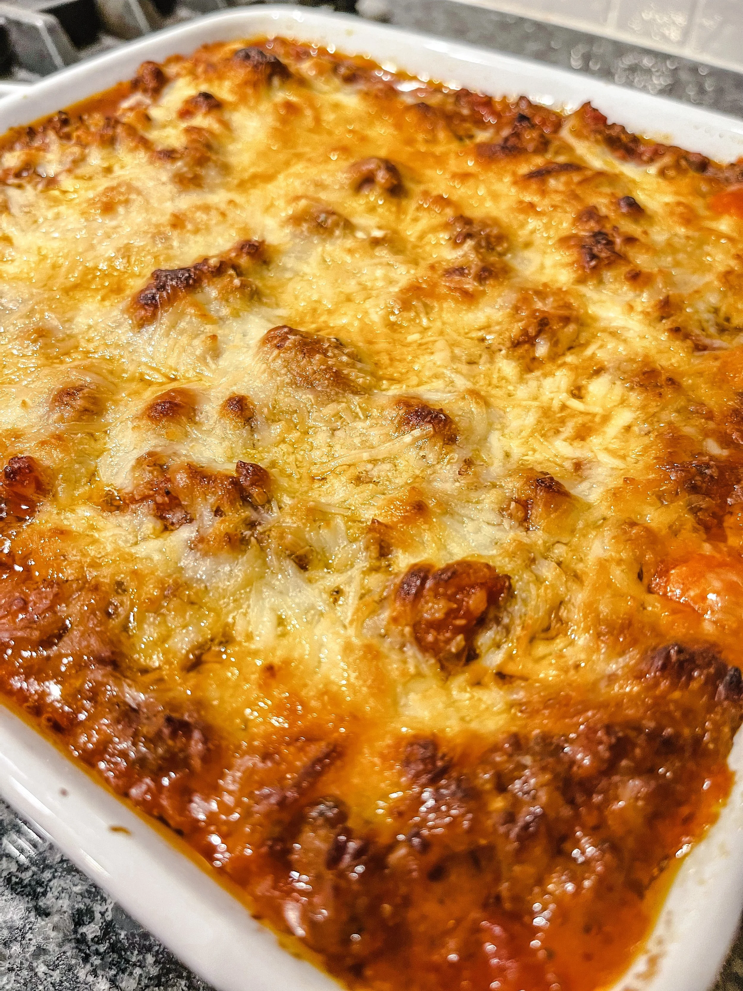 Now let’s get this dish rolling. Place half of the spaghetti noodles in the bottom of the dish. Next, you are going to spread the cheese mixture over top of the spaghetti. Once that is all on there, you are going to add the remaining noodles on top of the cheese mixture. Finally, pour the meat mixture over top of the spaghetti noodles, covering it all. Sprinkle on remaining mozzarella cheese and pop it in the oven. This will bake for about 30-40 minutes. You can broil for an extra 3 minutes if you choose too. My husband loves to use the “broil” button on the oven, although 8 out of 10 times he burns things. HA! At least I am being honest.
