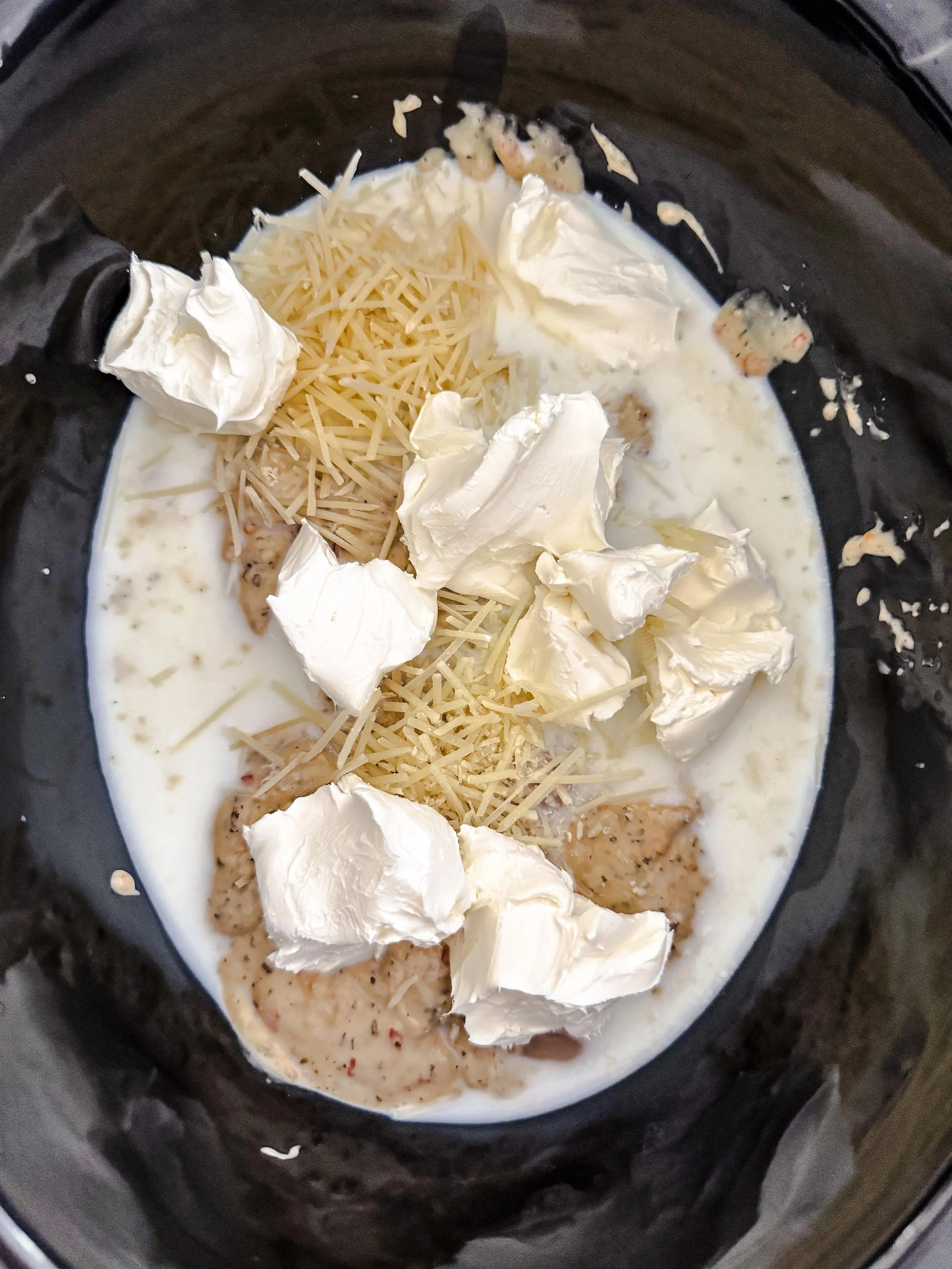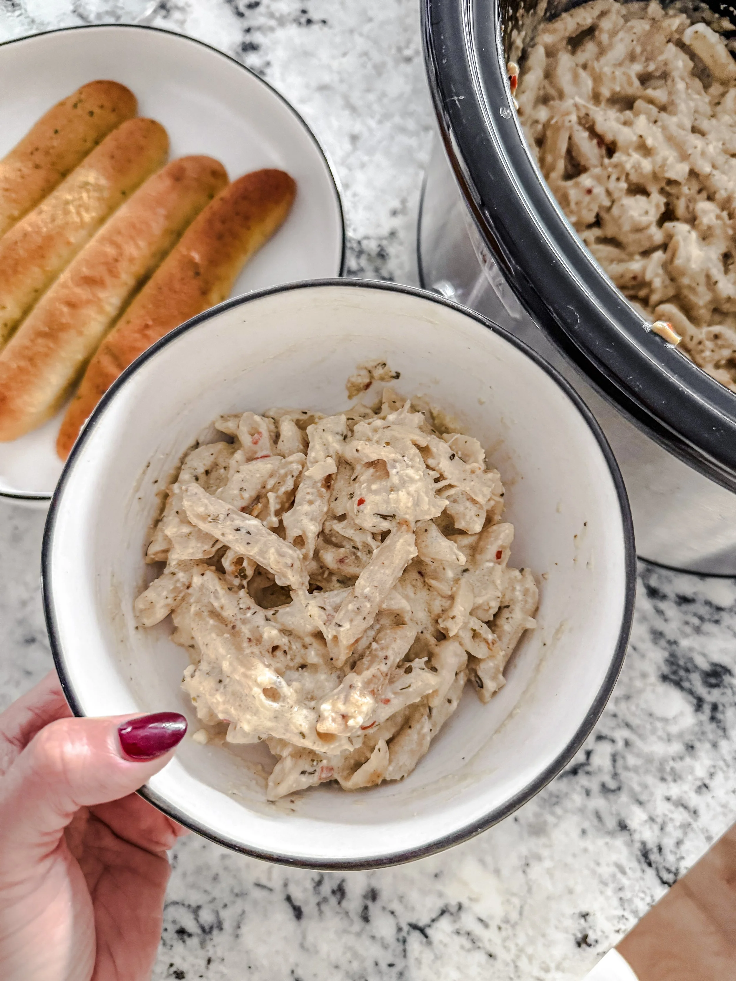 Crockpot season is here and I really cannot contain my excitement. This recipe is simple and delicious, even the neighbor boys come over for their second supper to finish it. Let’s make it. First off, place chicken in crockpot. Add the WHOLE bottle of the parmesan garlic buffalo wild wing sauce, milk, parmesan cheese, cream cheese and cover. Cook on high for 2-3 hours. Cut up the chicken, I used a meat masher. Cook pasta until al dente and add to the crockpot. Mix everything together. Grab a bowl, dish up and enjoy!
