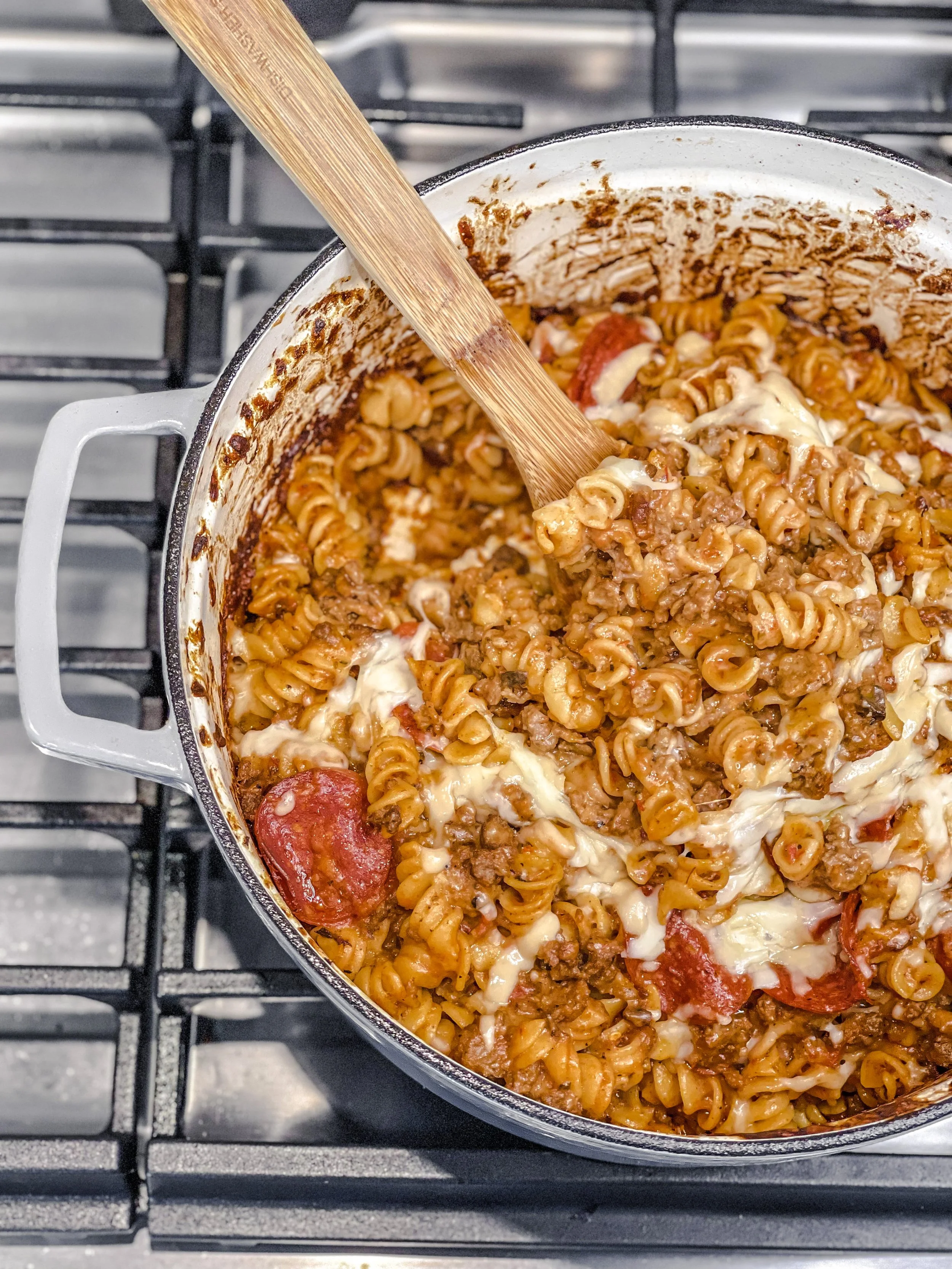 Alright back to the recipe. Once your noodles and meat are all cooked and ready to go, place them in a large bowl or combine them in a Dutch oven. Add in pizza sauce, mozzarella cheese, cream of mushroom soup, 1/2 can milk and pepperonis. I love to use the mini pepperoni if I can find them but if not I cut big pepperonis in half. My mom likes to throw in a jar of black olives but those do not make it in this house. Sprinkle in about a tsp of Pizza & Pasta Magic Seasoning Blend, you can substitute Italian seasoning or nothing at all. Mix everything together well so it is all covered and saturated. Place it in the oven for 1 hour.