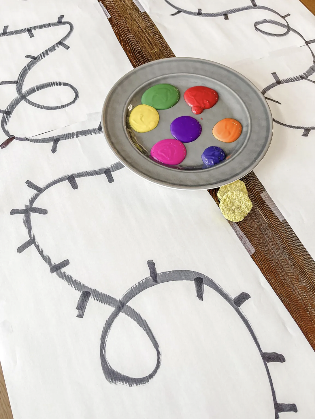This activity brings hand-eye coordination, fine motor skills, imaginative play and creativity. YAY! Here we go! First up grab your white craft paper, lay on the table.. I taped mine down to prevent it from moving around. With a black sharpie, draw your string of lights, making little lines for the bulbs to attach to. Pour some paint on a plate and make little circles out of sponges for stamping. You can show them where to stamp or let their creativity run wild.