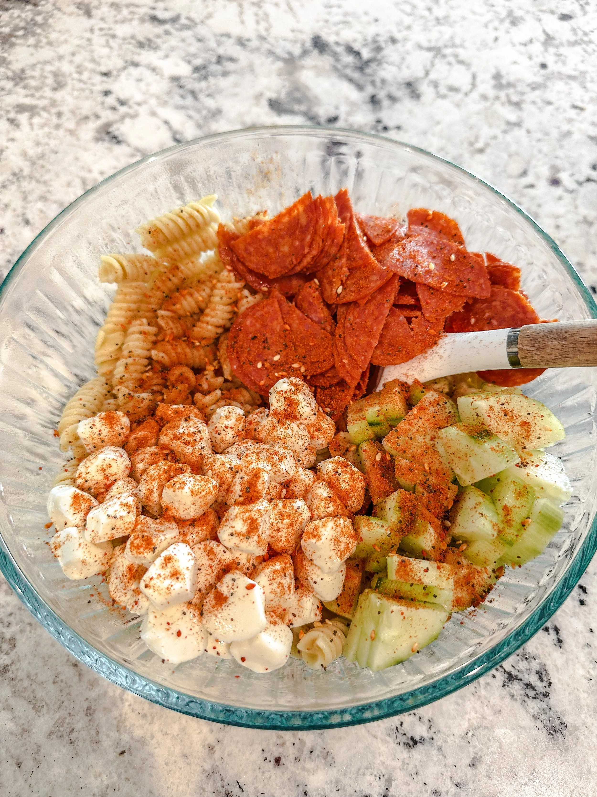 First, cook your rotini according to pkg instructions. Rinse under cold water and set aside. Chop up cucumbers and toss them into the noodles with pepperonis and mozzarella pearls. I like to cut my cucumbers in half as well as the pepperonis if I can’t find the mini ones.
