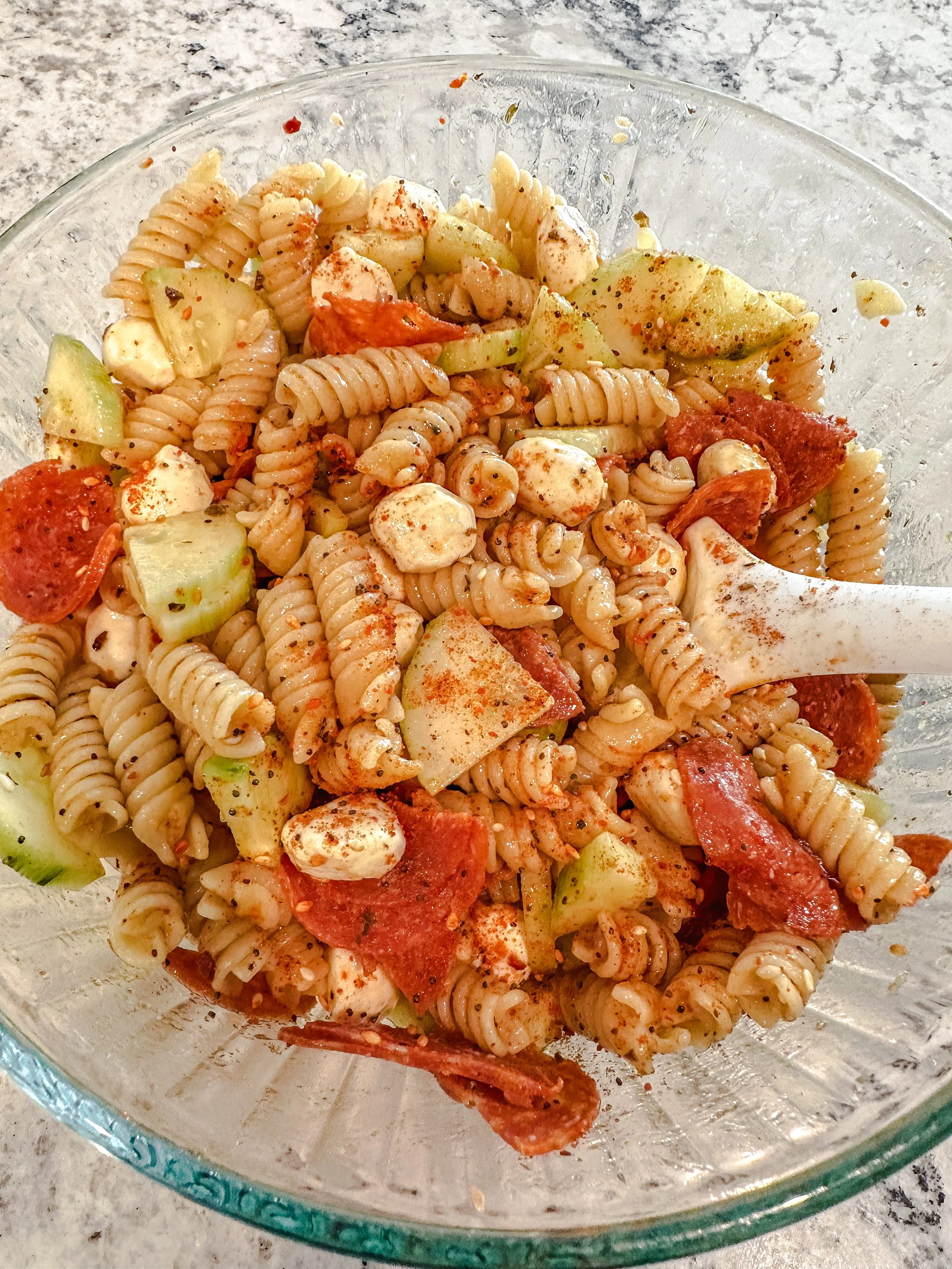 Next up, add in 1/2 a bottle of Italian dressing and make sure everything is incorporated. Now add about a half of a jar of salad supreme seasoning. This is what makes this kid friendly pasta salad taste SO GOOD. It is one of the best seasoning by far. Mix everything together so it is all covered with dressing and seasoning.